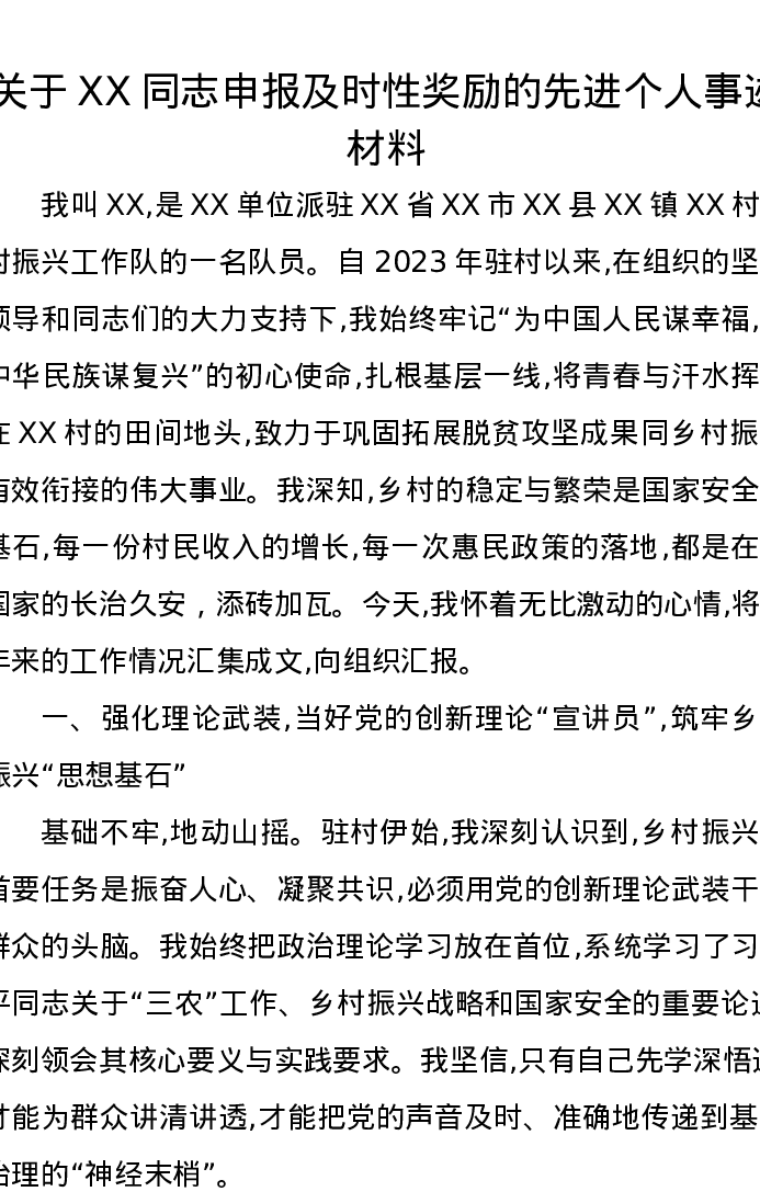 关于XX同志申报及时性奖励的先进个人事迹材料