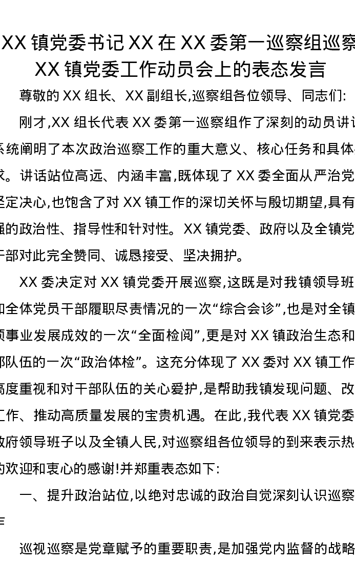 XX镇党委书记XX在XX委第一巡察组巡察XX镇党委工作动员会上的表态发言