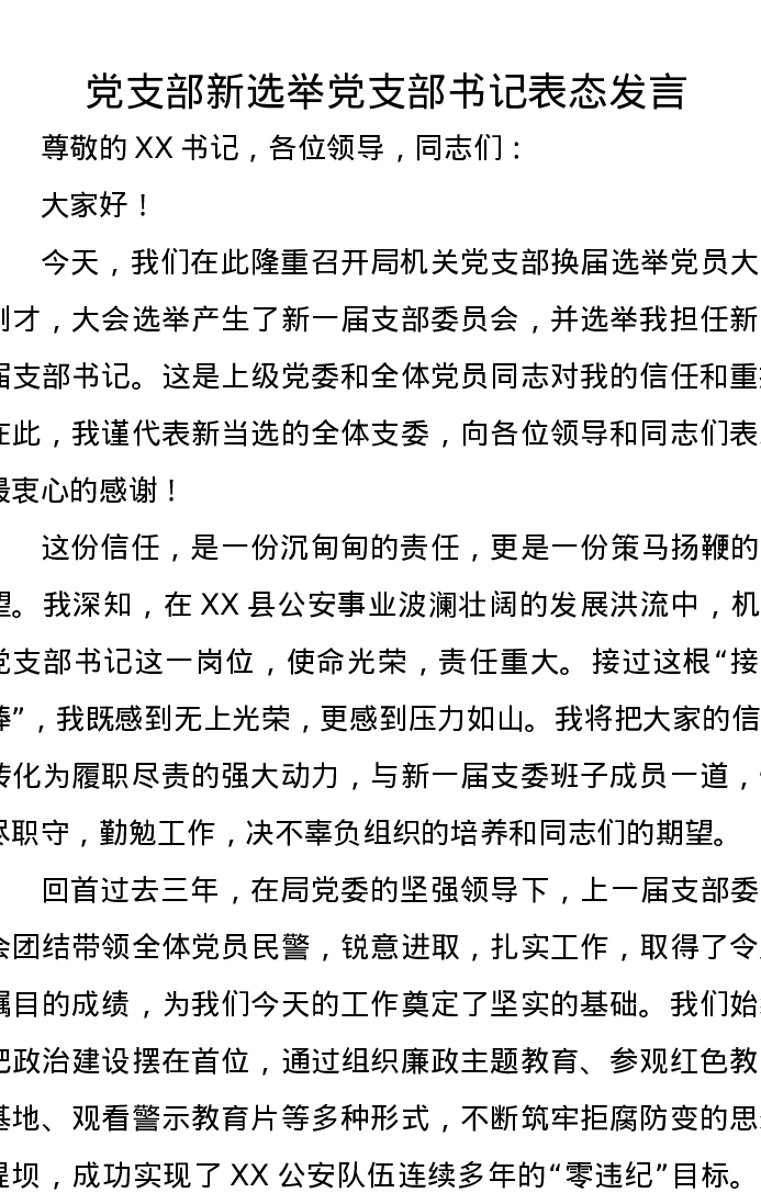 党支部新选举党支部书记表态发言