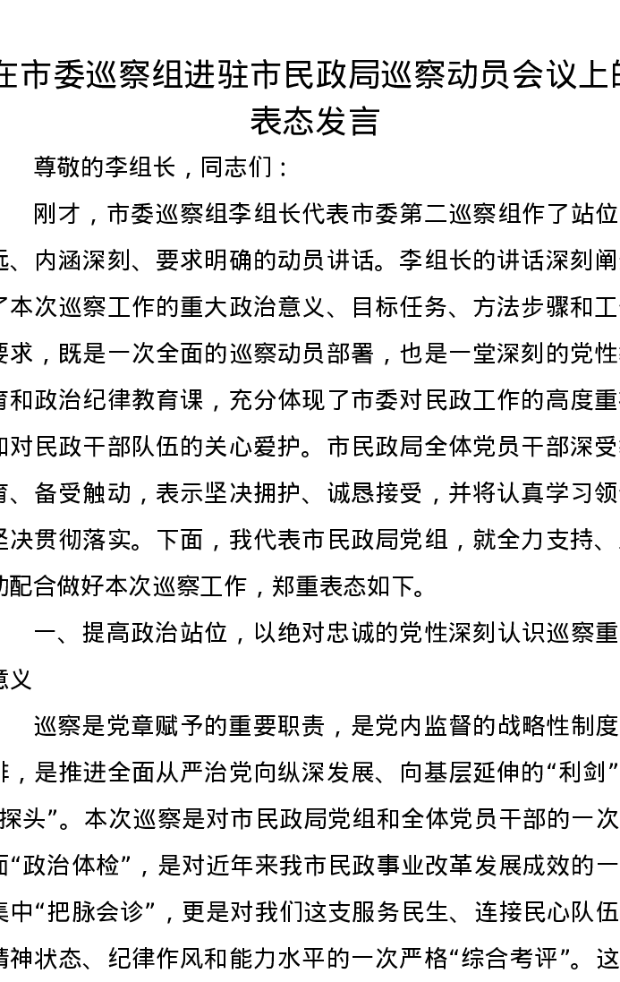 在市委巡察组进驻市民政局巡察动员会议上的表态发言
