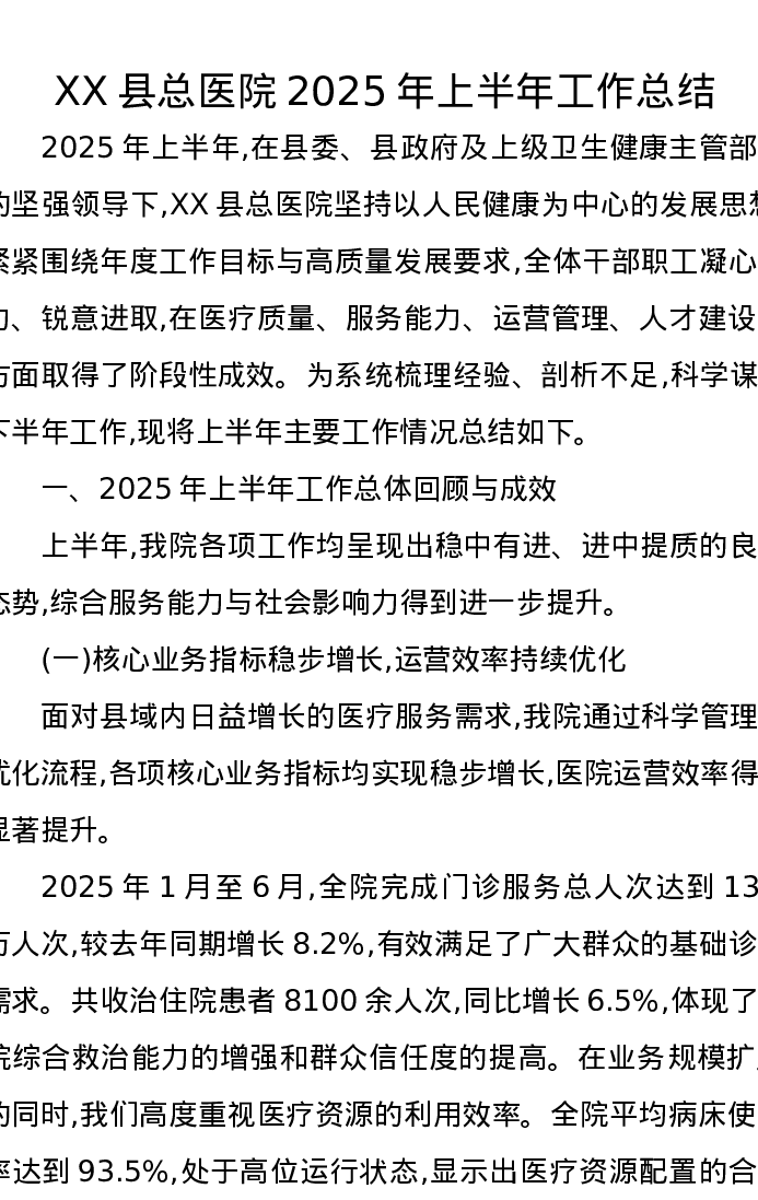 XX县总医院2025年上半年工作总结