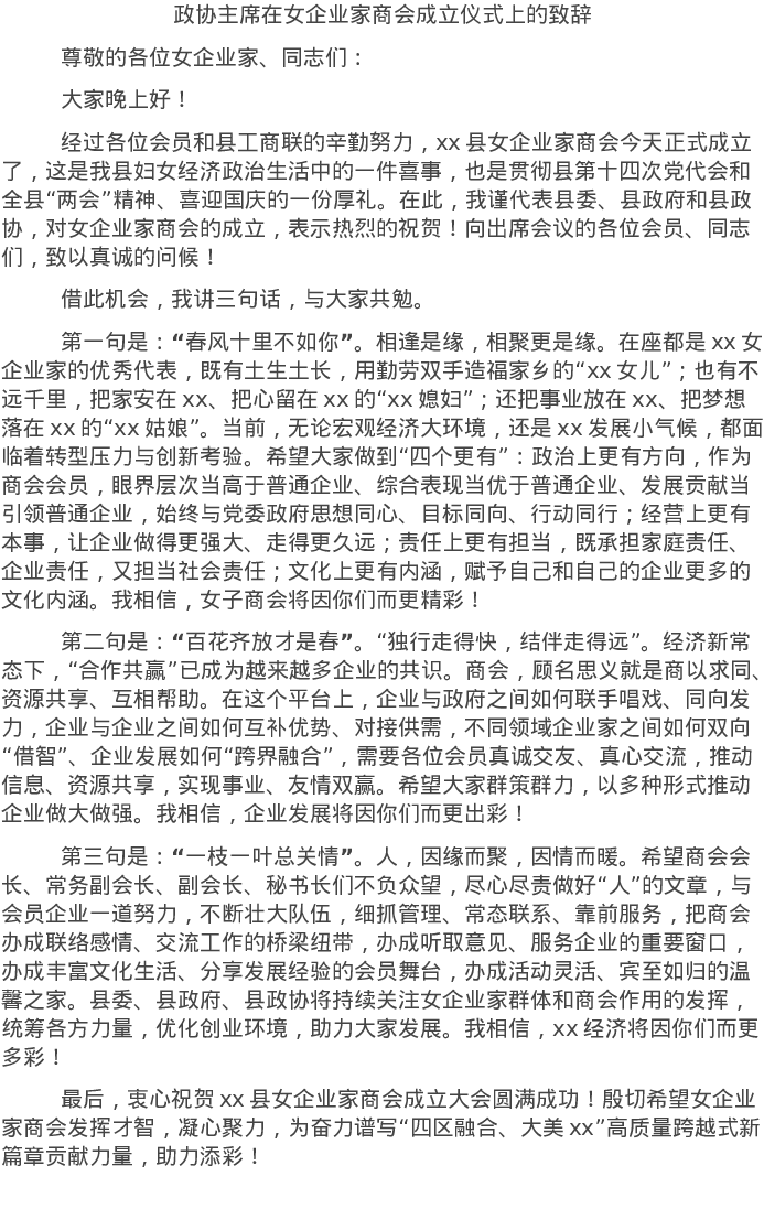 20220223政协主席在女企业家商会成立仪式上的致辞
