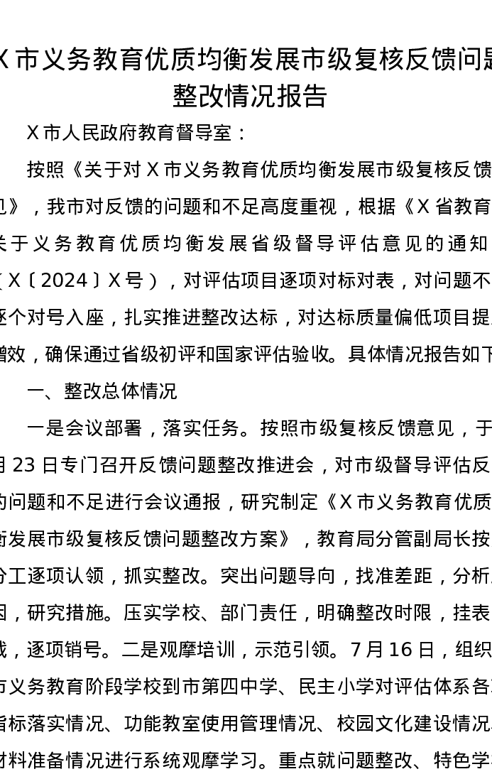 X市义务教育优质均衡发展市级复核反馈问题整改情况报告