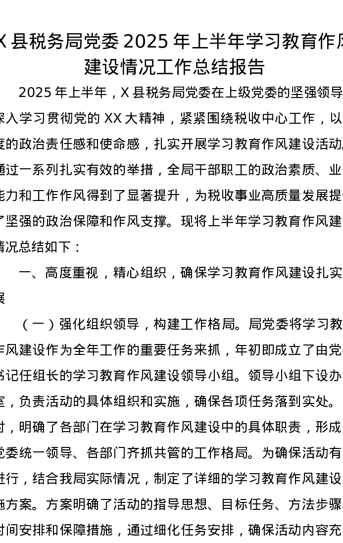 X县税务局党委2025年上半年学习教育作风建设情况工作总结报告