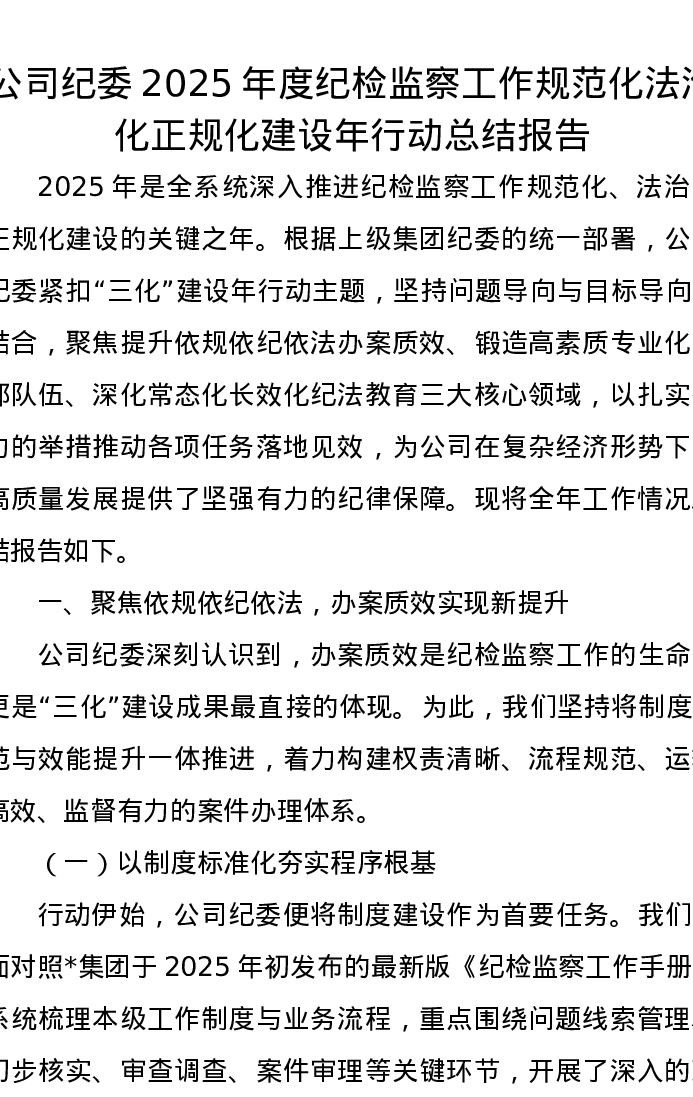 公司纪委2025年度纪检监察工作规范化法治化正规化建设年行动总结报告
