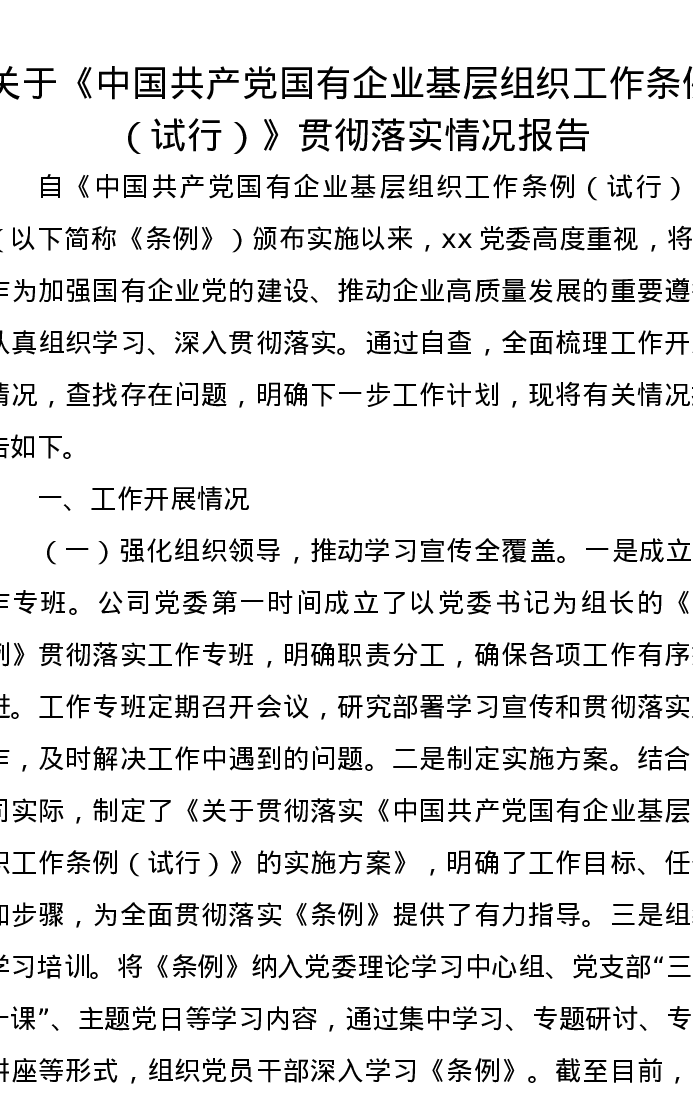 关于《中国共产党国有企业基层组织工作条例(试行)》贯彻落实情况报告