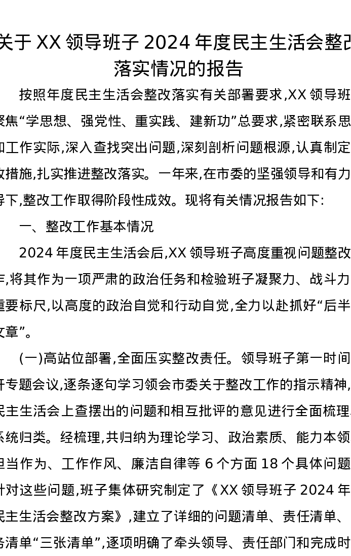 关于XX领导班子2024年度民主生活会整改落实情况的报告
