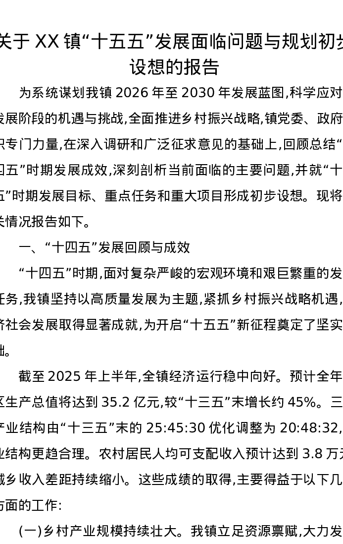 关于XX镇“十五五”发展面临问题与规划初步设想的报告
