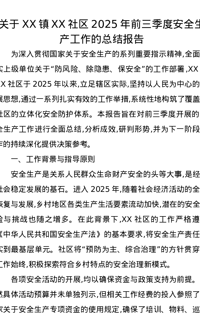 关于XX镇XX社区2025年前三季度安全生产工作的总结报告