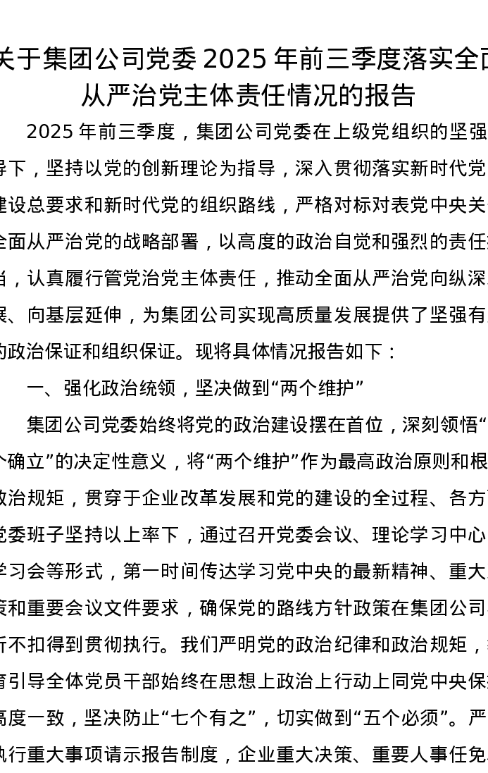 关于集团公司党委2025年前三季度落实全面从严治党主体责任情况的报告