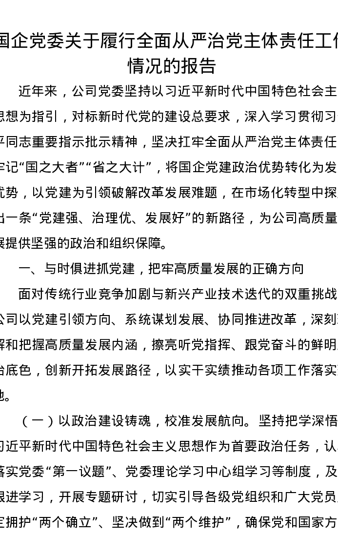 国企党委关于履行全面从严治党主体责任工作情况的报告