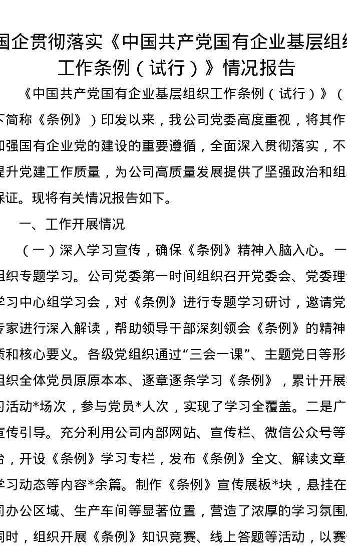 国企贯彻落实《中国共产党国有企业基层组织工作条例(试行)》情况报告