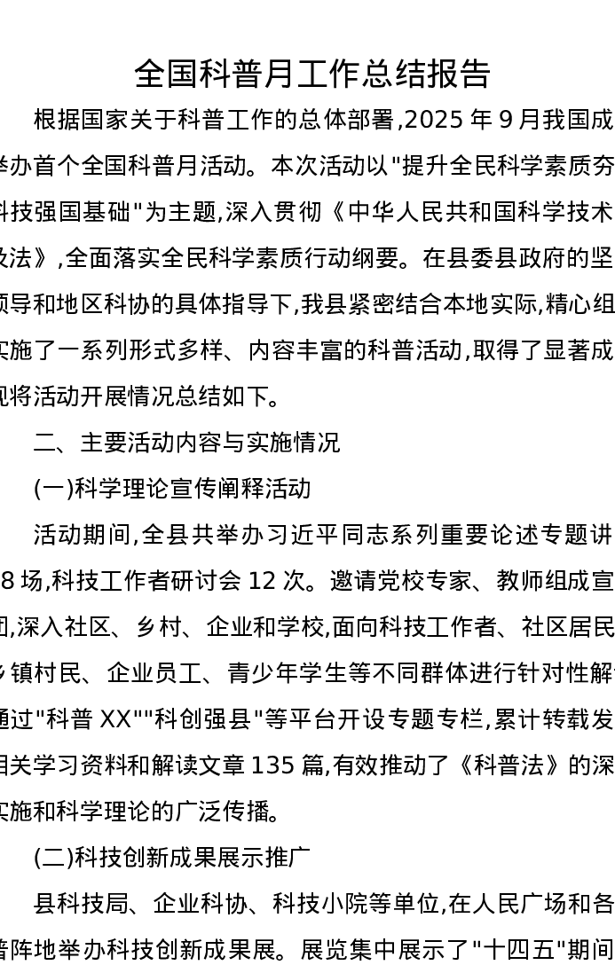 全国科普月工作总结报告