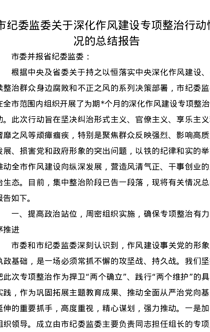 市纪委监委关于深化作风建设专项整治行动情况的总结报告