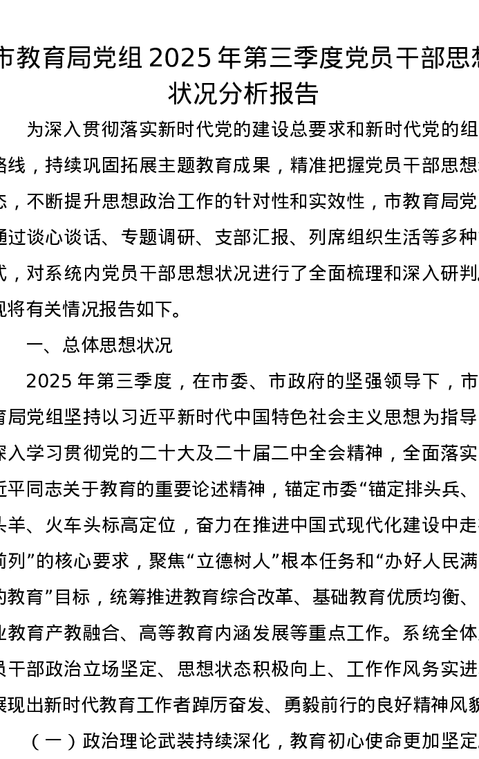 市教育局党组2025年第三季度党员干部思想状况分析报告