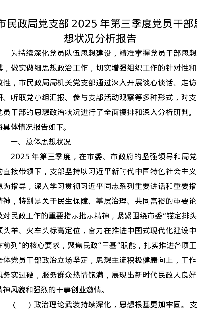 市民政局党支部2025年第三季度党员干部思想状况分析报告