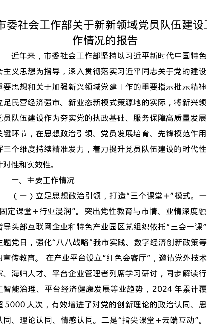 市委社会工作部关于新新领域党员队伍建设工作情况的报告