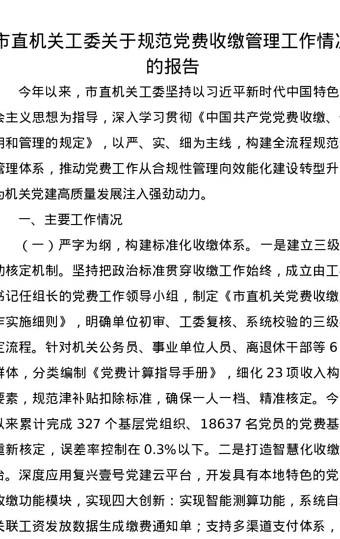 市直机关工委关于规范党费收缴管理工作情况的报告