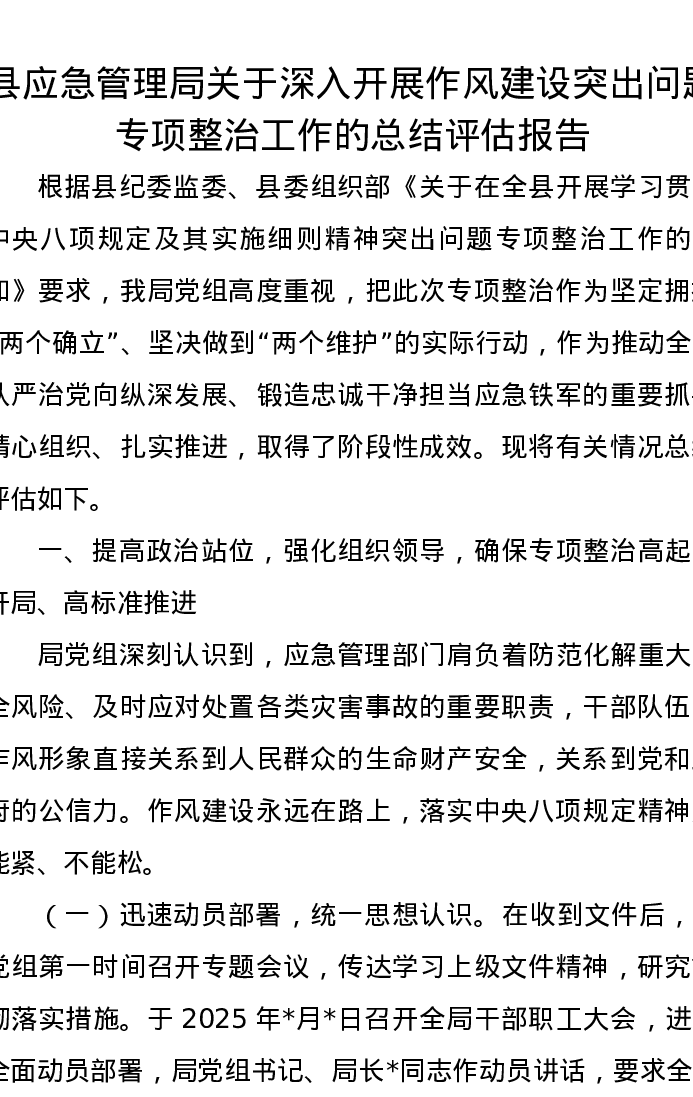 县应急管理局关于深入开展作风建设突出问题专项整治工作的总结评估报告