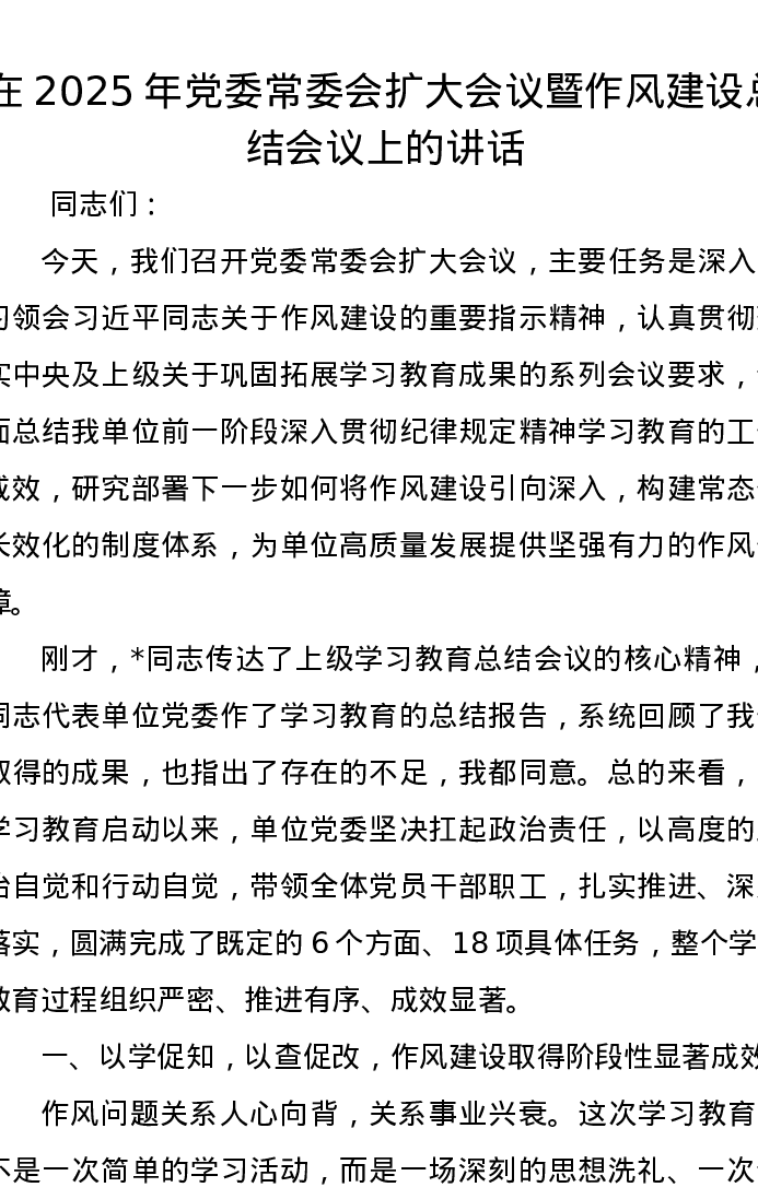 在2025年党委常委会扩大会议暨作风建设总结会议上的讲话