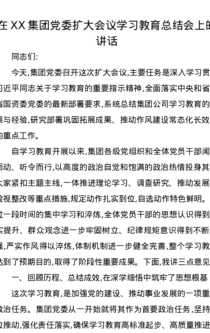 在XX集团党委扩大会议学习教育总结会上的讲话