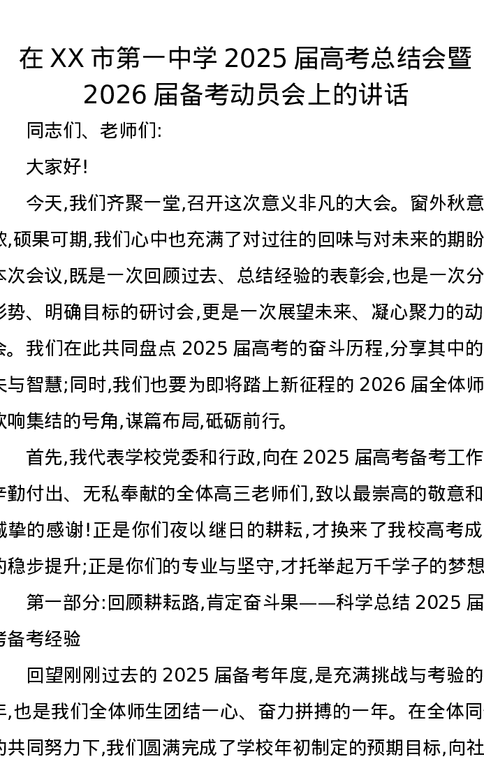 在XX市第一中学2025届高考总结会暨2026届备考动员会上的讲话