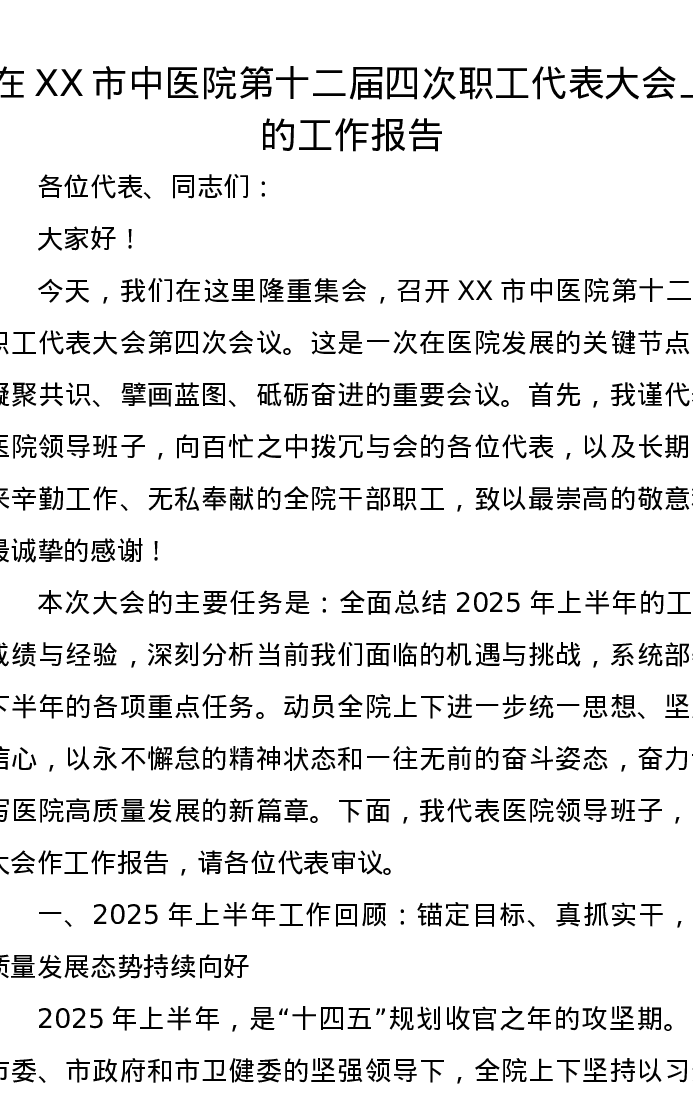 在XX市中医院第十二届四次职工代表大会上的工作报告