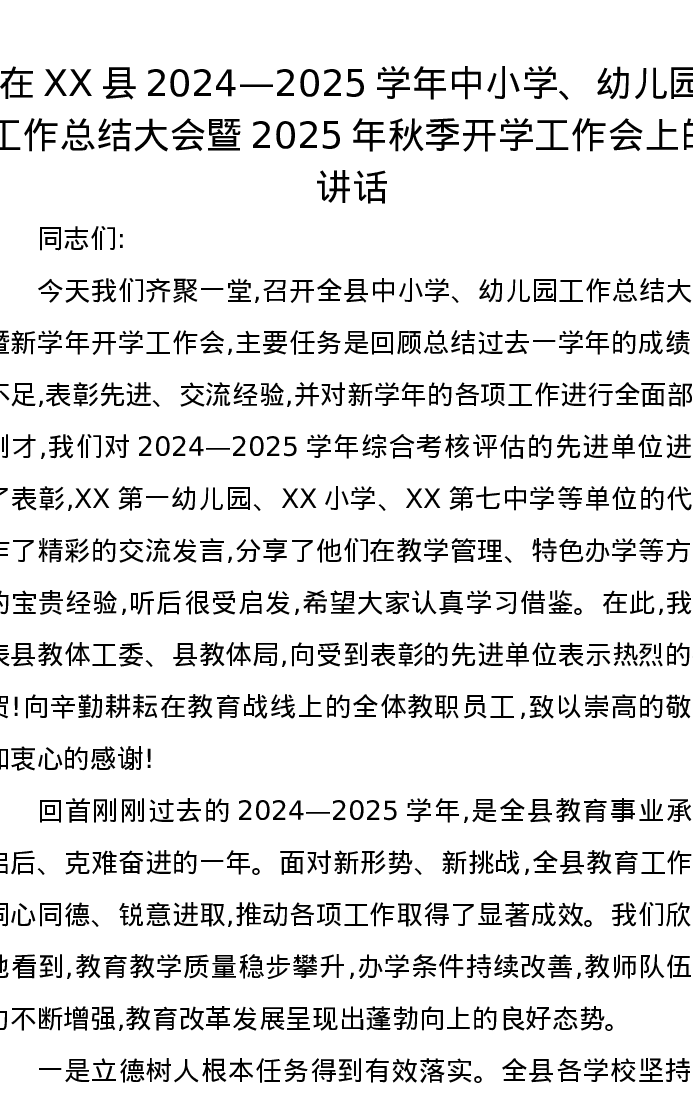 在XX县2024—2025学年中小学、幼儿园工作总结大会暨2025年秋季开学工作会上的讲话