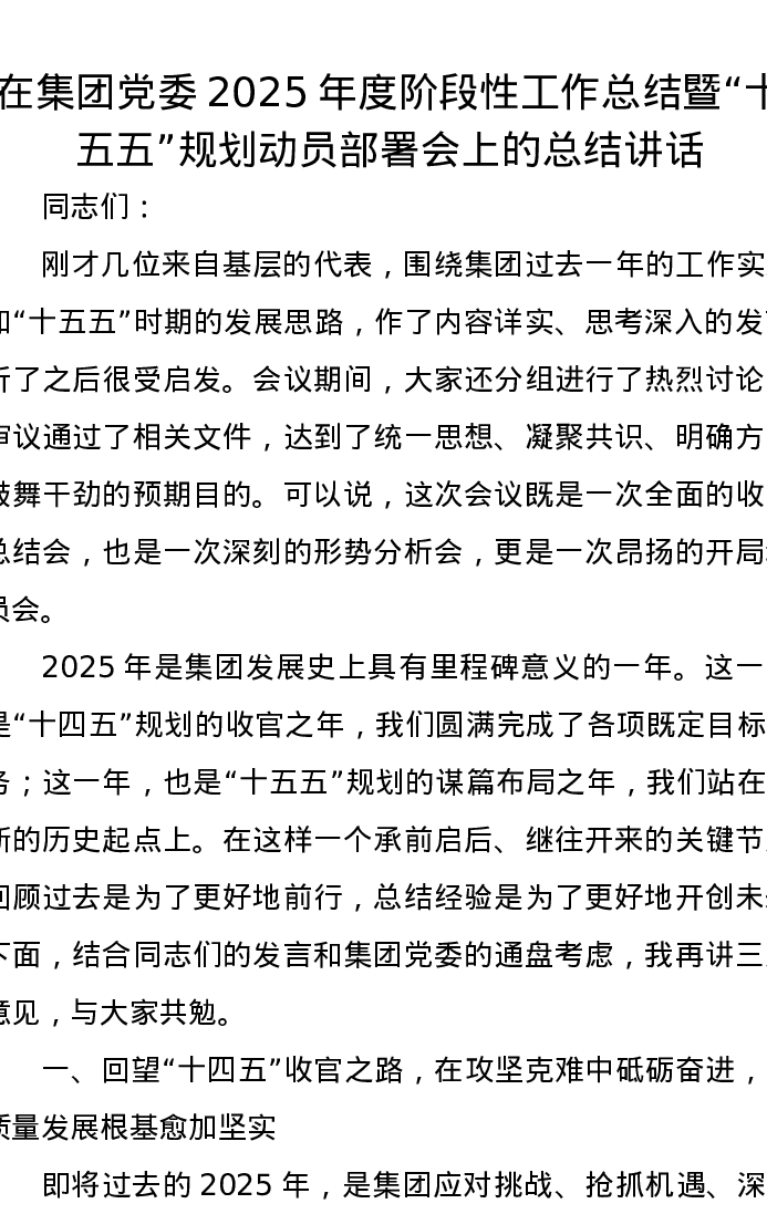 在集团党委2025年度阶段性工作总结暨“十五五”规划动员部署会上的总结讲话