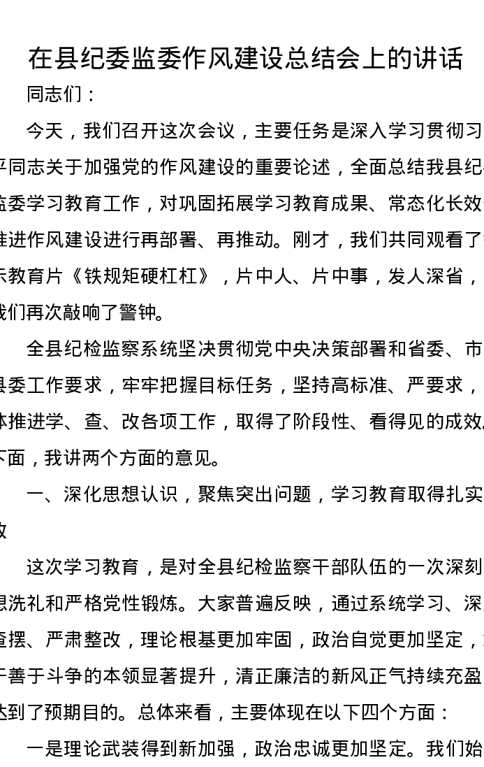 在县纪委监委作风建设总结会上的讲话