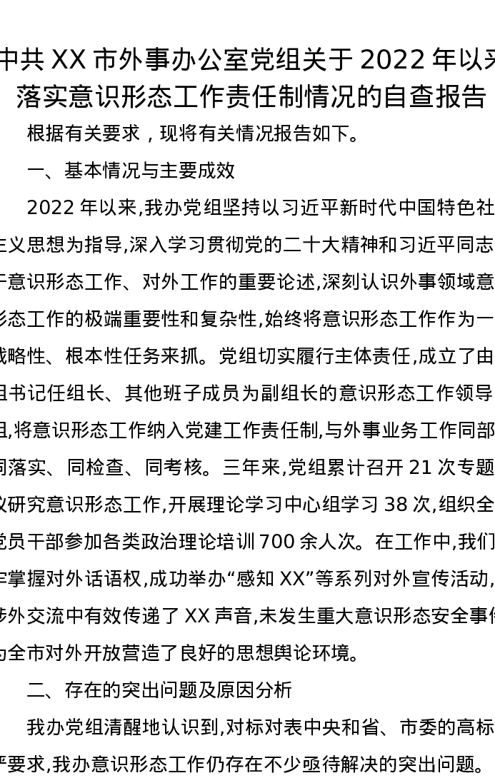 中共XX市外事办公室党组关于2022年以来落实意识形态工作责任制情况的自查报告