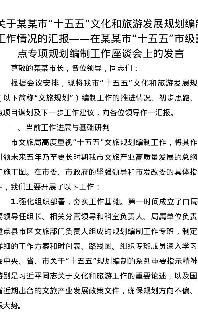 关于某某市“十五五”文化和旅游发展规划编制工作情况的汇报——在某某市“十五五”市级重点专项规划编制工作座谈会上的发言