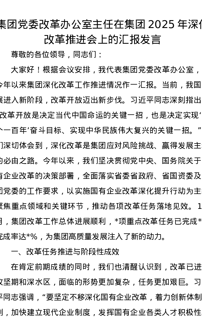 集团党委改革办公室主任在集团2025年深化改革推进会上的汇报发言