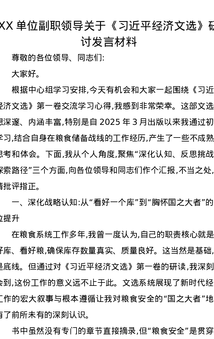 XX单位副职领导关于《习近平经济文选》研讨发言材料5