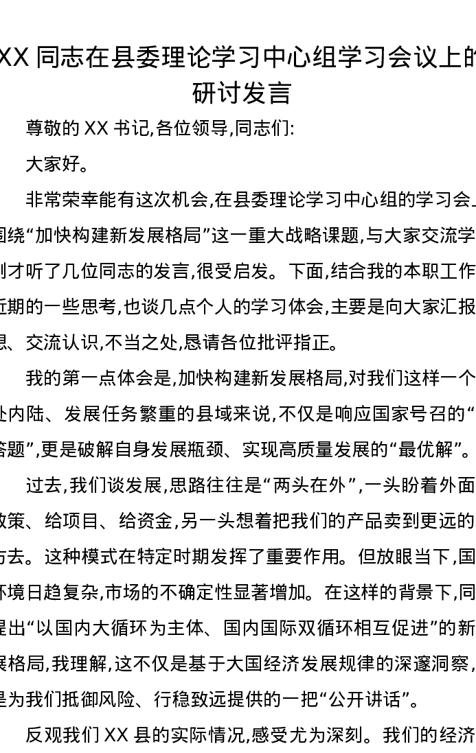XX同志在县委理论学习中心组学习会议上的研讨发言