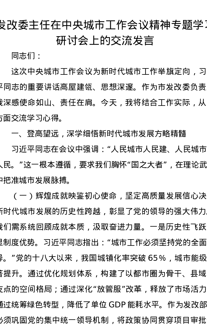 发改委主任在中央城市工作会议精神专题学习研讨会上的交流发言