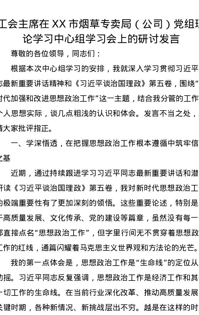 工会主席在XX市烟草专卖局(公司)党组理论学习中心组学习《习近平谈治国理政》第五卷会上的研讨发言