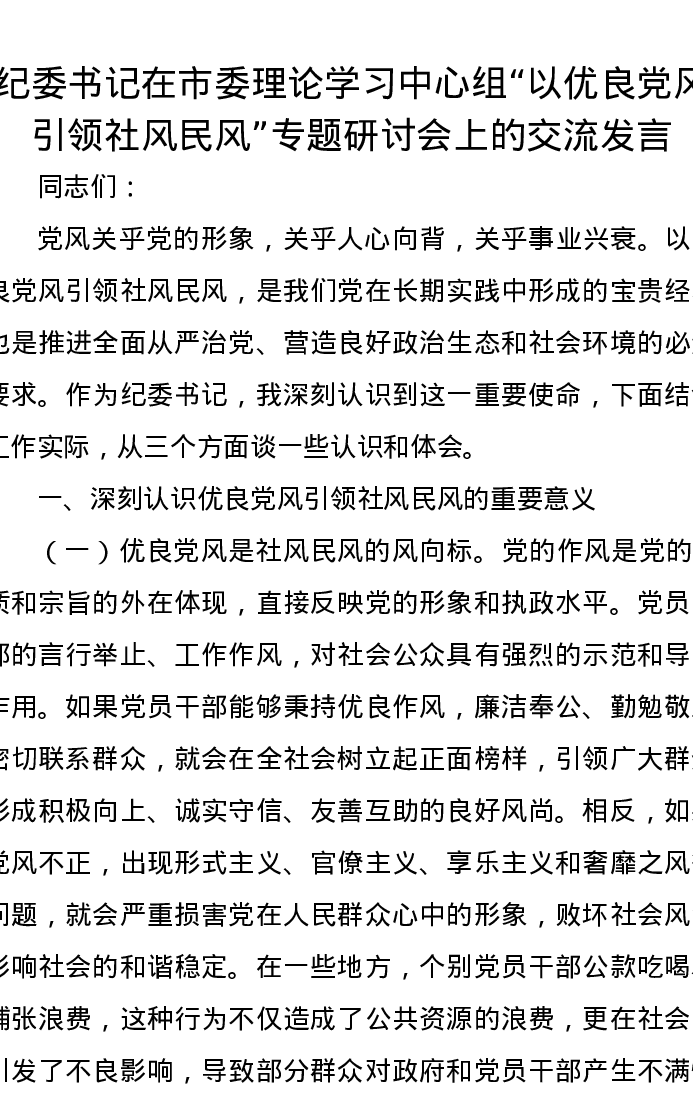 纪委书记在市委理论学习中心组“以优良党风引领社风民风”专题研讨会上的交流发言