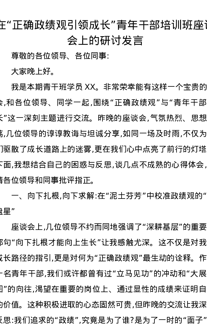 在“正确政绩观引领成长”青年干部培训班座谈会上的研讨发言