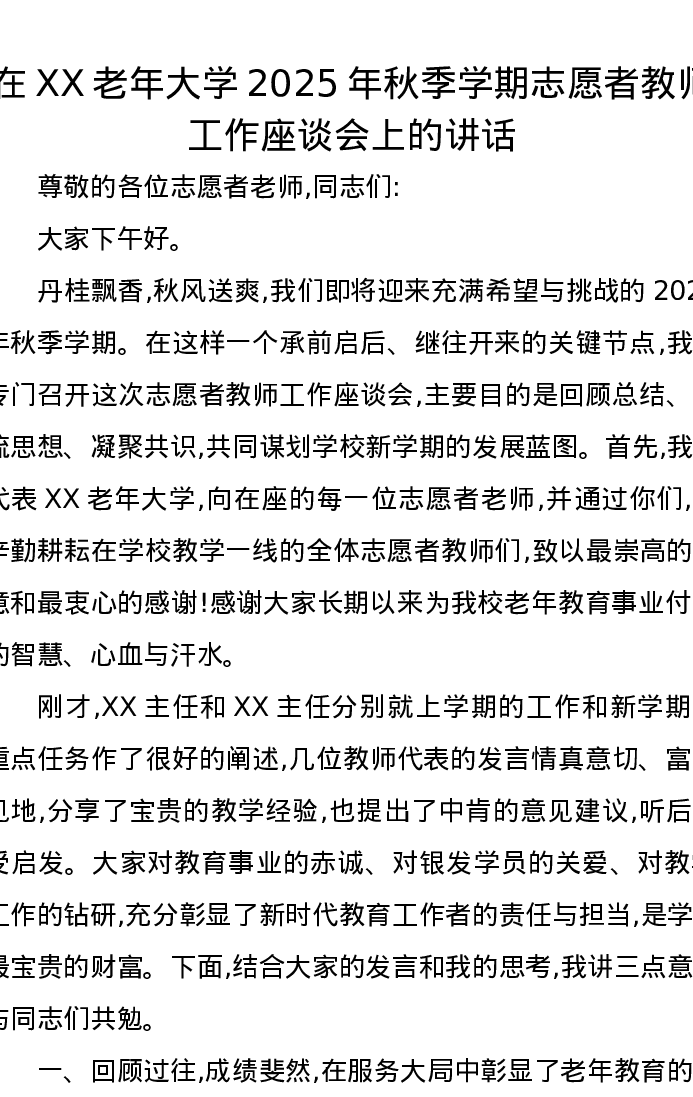 在XX老年大学2025年秋季学期志愿者教师工作座谈会上的讲话