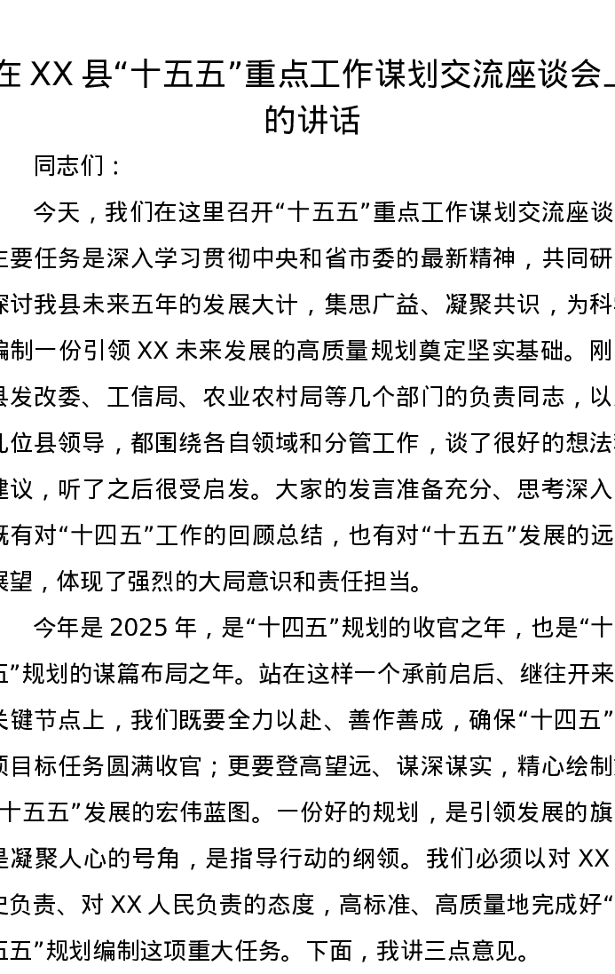 在XX县“十五五”重点工作谋划交流座谈会上的讲话
