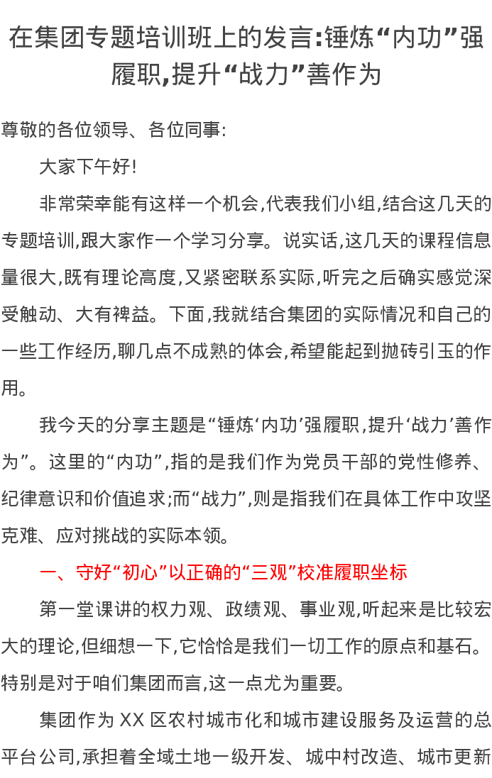 在集团专题培训班上的发言:锤炼“内功”强履职,提升“战力”善作为