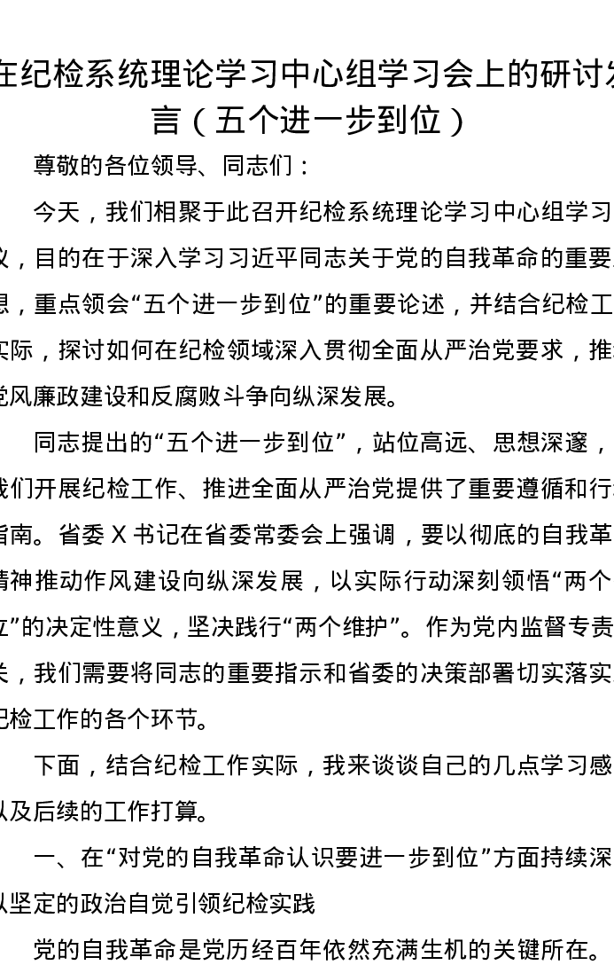 在纪检系统理论学习中心组学习会上的研讨发言(五个进一步到位)
