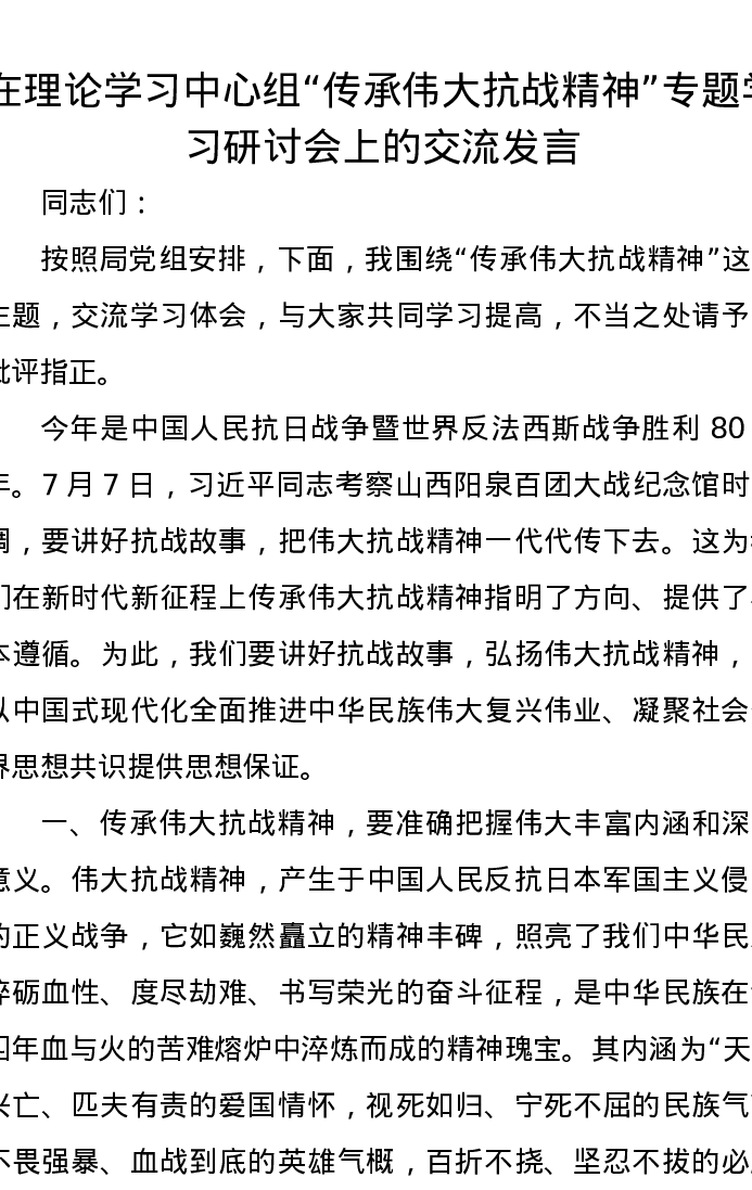 在理论学习中心组“传承伟大抗战精神”专题学习研讨会上的交流发言