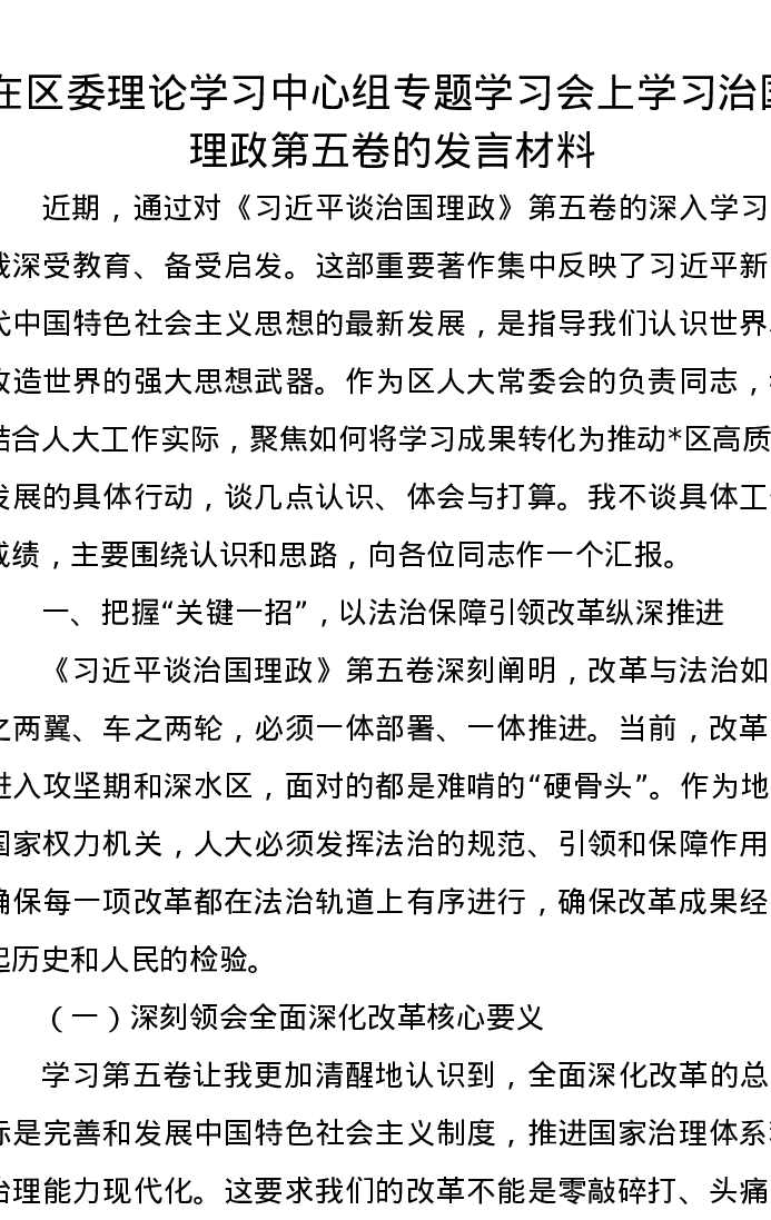 在区委理论学习中心组专题学习会上学习治国理政第五卷的发言材料