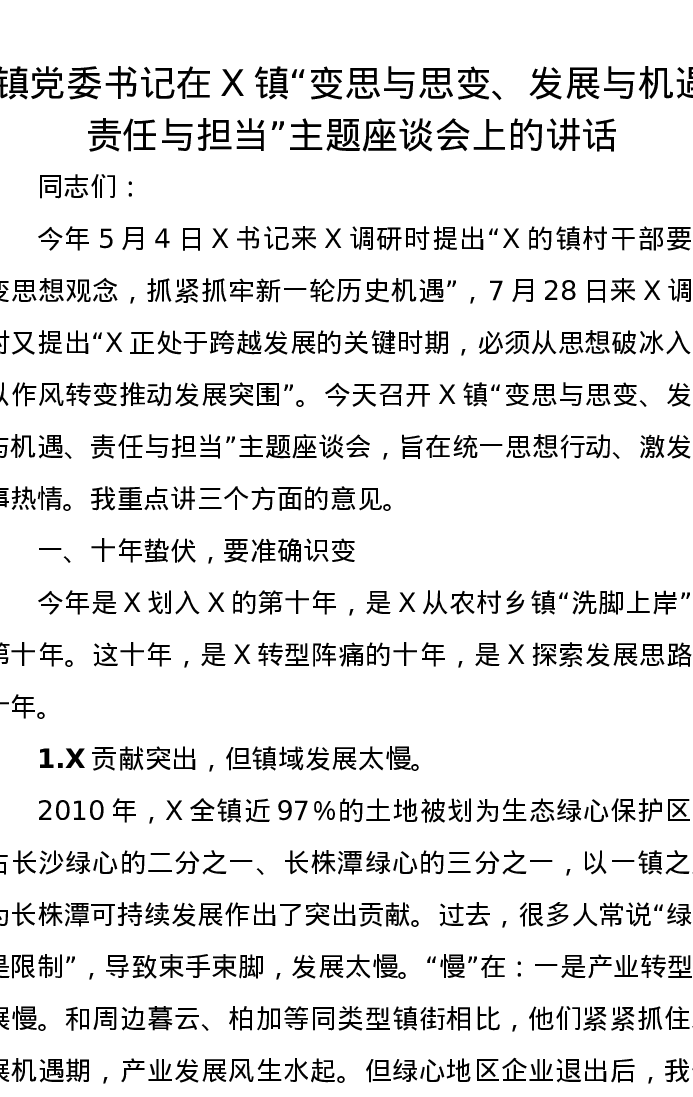 镇党委书记在X镇“变思与思变、发展与机遇、责任与担当”主题座谈会上的讲话