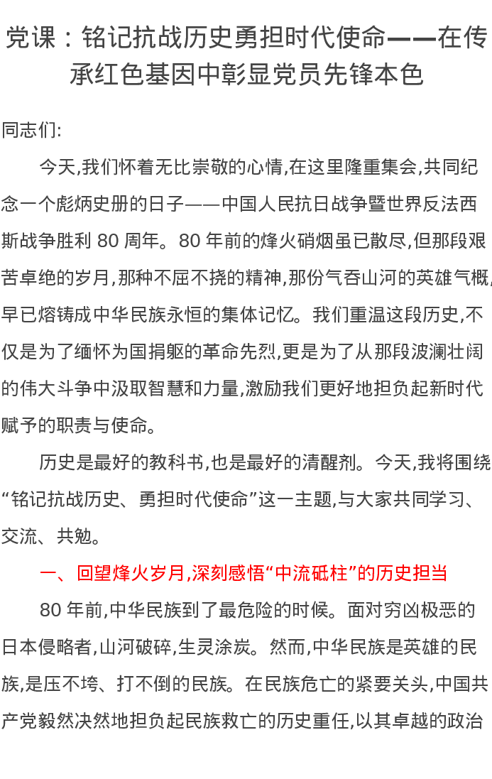 党课讲稿:铭记抗战历史勇担时代使命——在传承红色基因中彰显党员先锋本色