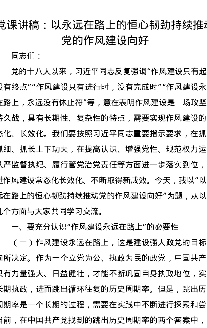 党课讲稿:以永远在路上的恒心韧劲 持续推动党的作风建设向好