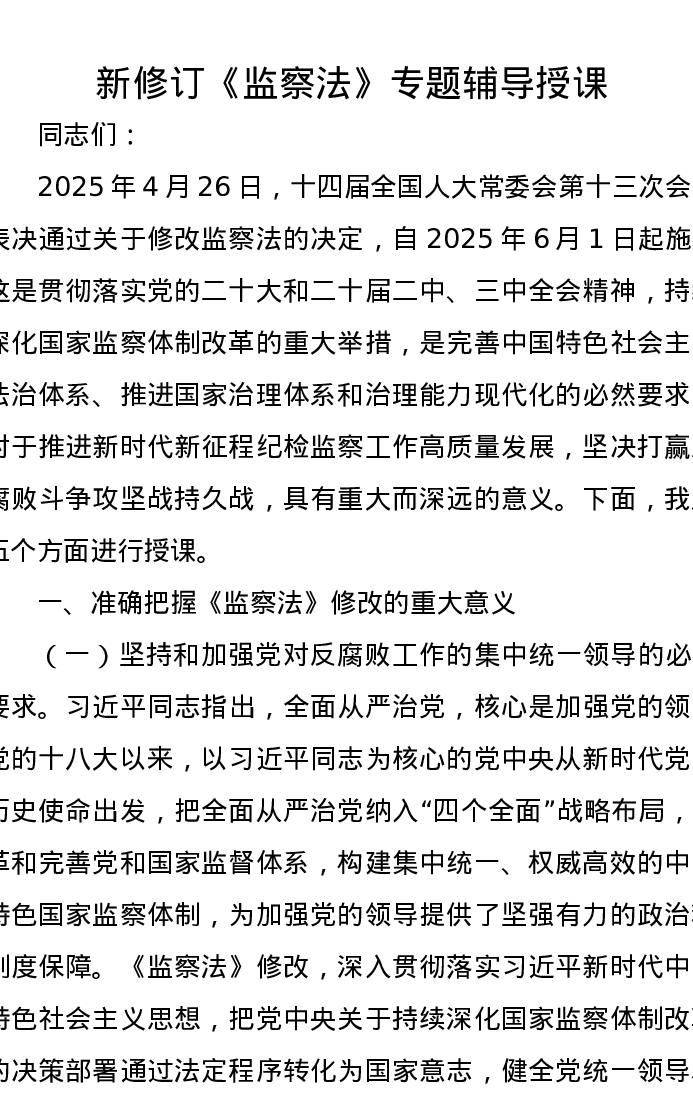 新修订《监察法》专题辅导授课党课讲稿