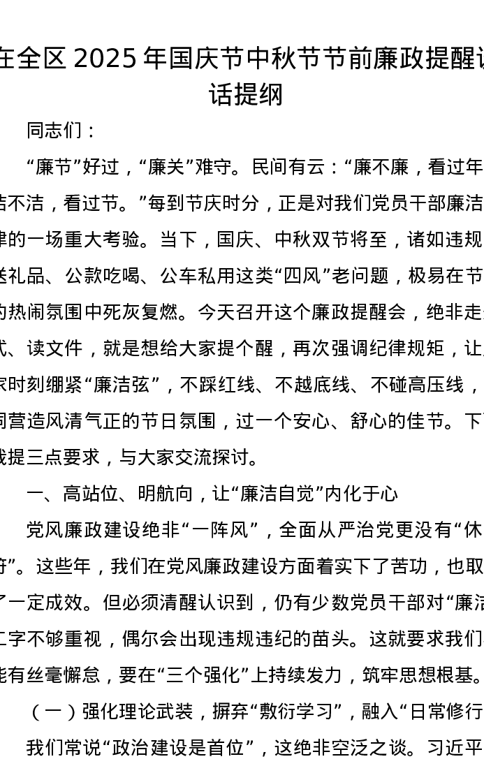 在全区2025年国庆节中秋节节前廉政提醒谈话提纲